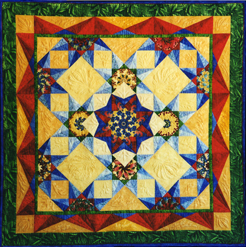 Kaleiding Stars is machine pieced and extensively machine quilted. I'd been looking at a quilting magazine while trying to figure out how to use the focus fabric, and fell asleep on the sofa. When I woke up, the design was in my head! I used Electric Quilt to draft the design and play with the color combinations. Completed 1999. This quilt was awarded Second Place in both the 1999 Hoffman Challenge and the 2001 Houston International Quilt Association Show.