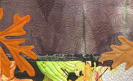 Last Dance was completed in the Fall of 2008. The central image is a digital collage, surrounded by hand dyed, appliqued leaves and a hand dyed border. The border is quilted to resemble lichen and the litter found on a forest floor. Last Dance was awarded third place in the Miniature Art Quilts category at the 2009 International Quilt Association Show in Houston, Texas. Look for it in the March, 2010 issue of Machine Quilting Unlimited, and also the 2011 IQA calendar of award winning quilts, published by Martingale.