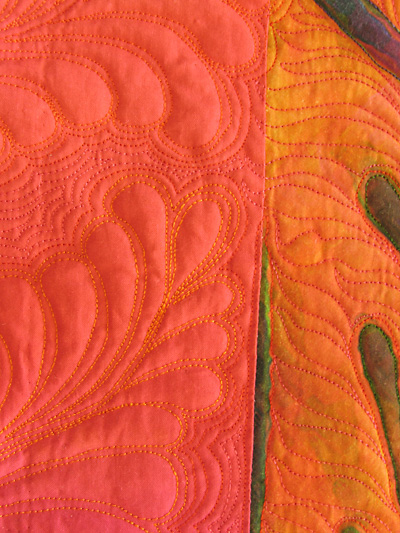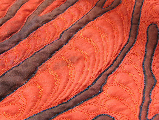 Making Under the Rainbow continued The five central panels and the border were pieced together. The batting is Hobbs Heirloom Wool and the backing is hand dyed. The quilting was begun on May 11, 2007 and finished on June 12, 2007. Rayon thread was used on the front, and both Bottom Line and DMC Machine Embroidery thread were used in the bobbin. Here are some detail shots of the quilting